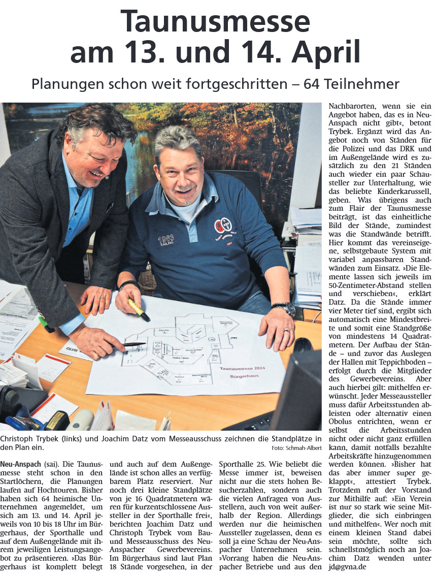 Neu-Anspach (sai). Die Taunusmesse steht schon in den Startlöchern, die Planungen laufen auf Hochtouren. Bisher haben sich 64 heimische Unternehmen angemeldet, um sich am 13. und 14. April jeweils von 10 - 18 Uhr im Bürgerhaus, der Sporthalle und auf dem Außengelände mit ihrem jeweiligen Leistungsangebot zu präsentieren.
